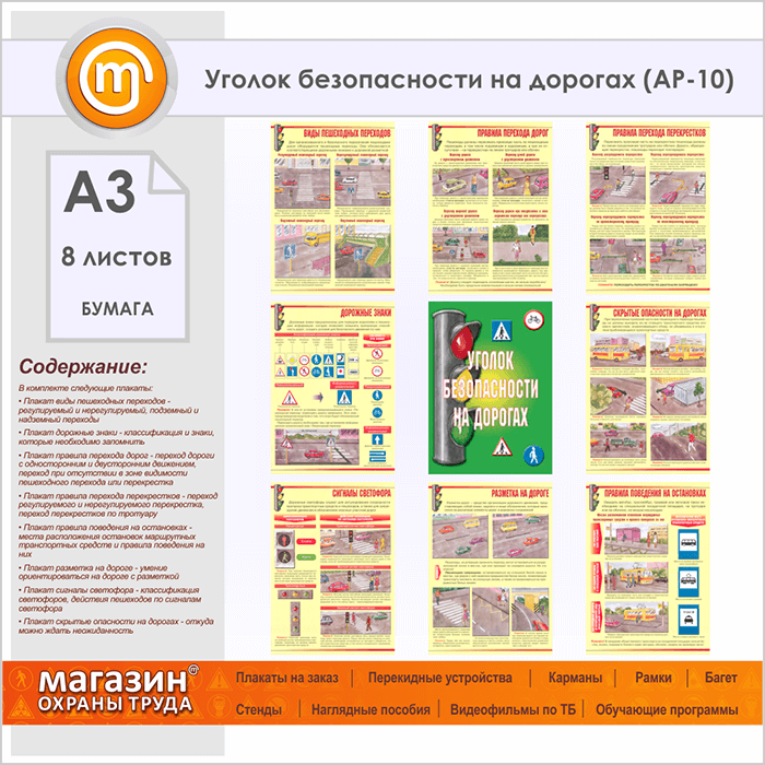 Плакаты «Уголок безопасности на дорогах» (АР-10, бумага, А3, 8 листов) в Нижнекамске купить
