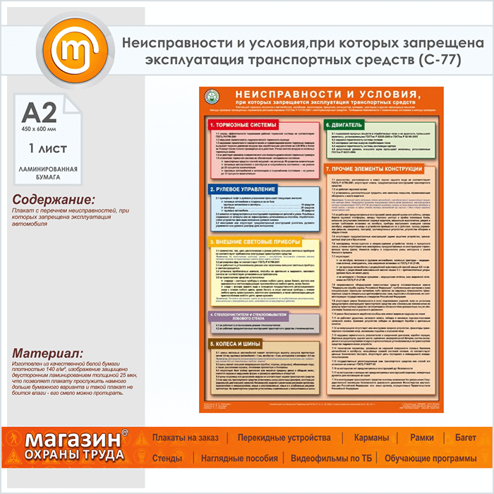 Плакат «Неисправности и условия, при которых запрещена эксплуатация транспортных средств» (С-77, ламинированная бумага, А2, 1 лист) в Нижнекамске купить
