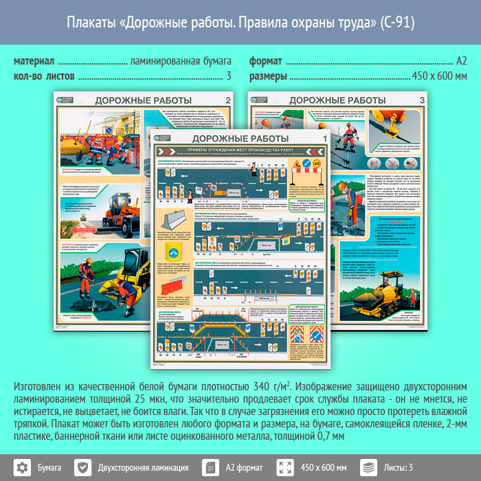 Плакаты «Дорожные работы. Правила охраны труда» (С-91, ламинированная бумага, А2, 3 листа) в Нижнекамске купить