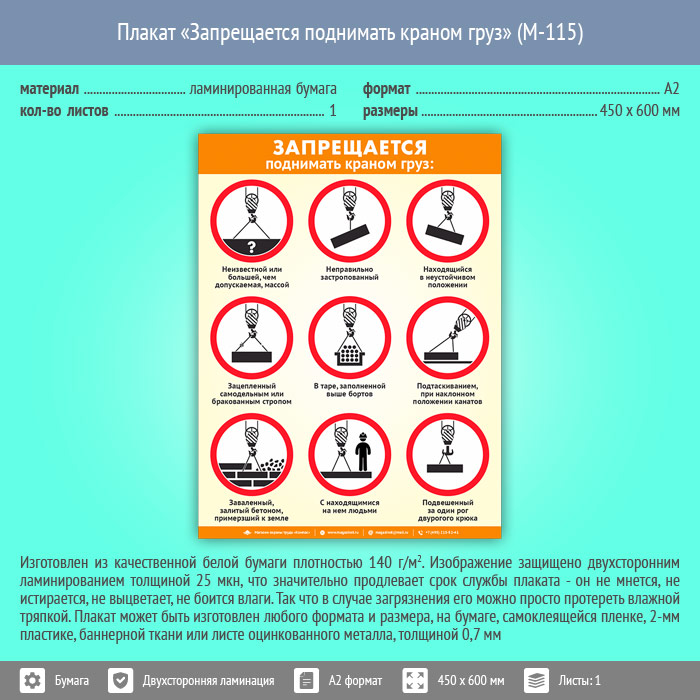 Плакат «Запрещается поднимать краном груз» (М-115, ламинированная бумага, А2, 1 лист) в Нижнекамске купить