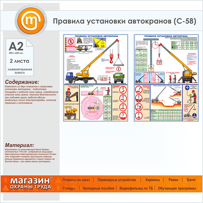Плакаты «Правила установки автокранов» (С-58, ламинированная бумага, А2, 2 листа) в Нижнекамске купить
