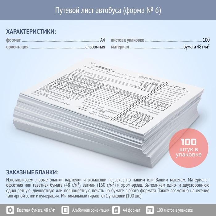 Путевой лист автобуса (форма № 6, упаковка из 100 штук) в Нижнекамске купить