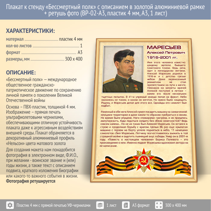 Плакат к стенду «Бессмертный полк» с описанием в золотой (матовой) алюминиевой рамке + ретушь фото (BP-02-A3, пластик 4 мм, А3, 1 лист) в Нижнекамске купить