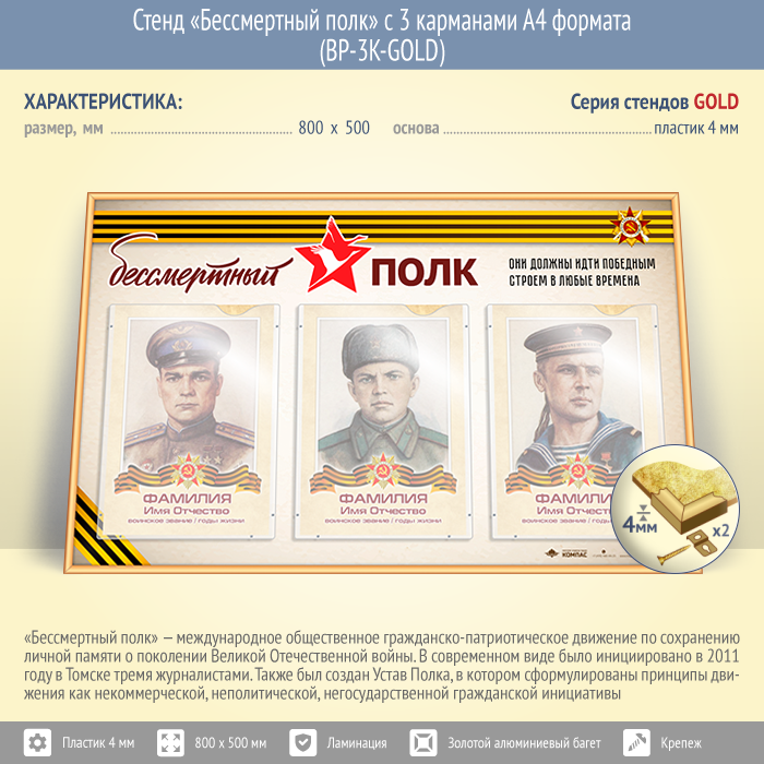 Стенд «Бессмертный полк» с 3 карманами А4 формата (BP-3K-GOLD) в Нижнекамске купить