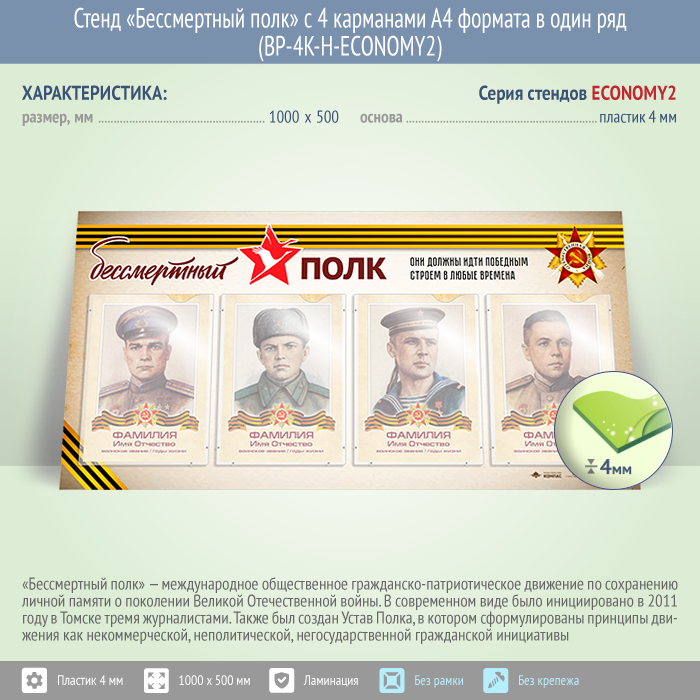 Стенд «Бессмертный полк» с 4 карманами А4 формата в один ряд (BP-4K-H-ECONOMY2) в Нижнекамске купить