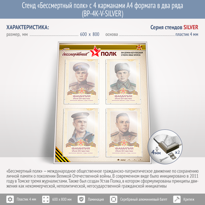 Стенд «Бессмертный полк» с 4 карманами А4 формата в два ряда (BP-4K-V-SILVER) в Нижнекамске купить