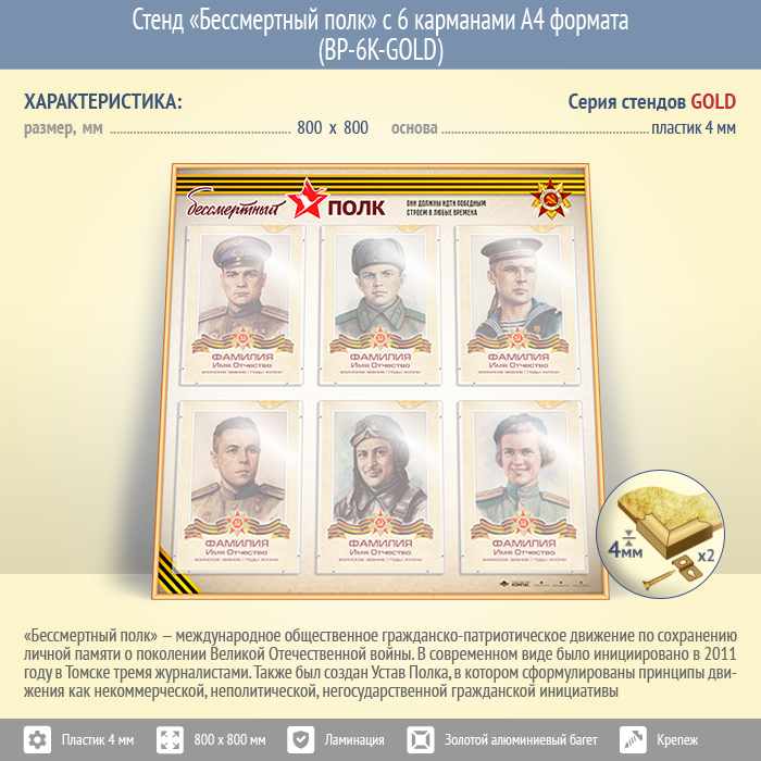 Стенд «Бессмертный полк» с 6 карманами А4 формата (BP-6K-GOLD) в Нижнекамске купить