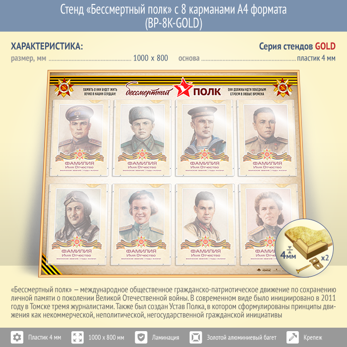 Стенд «Бессмертный полк» с 8 карманами А4 формата (BP-8K-GOLD) в Нижнекамске купить