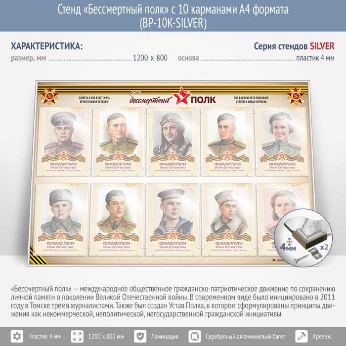 Стенд «Бессмертный полк» с 10 карманами А4 формата (BP-10K-SILVER) в Нижнекамске купить