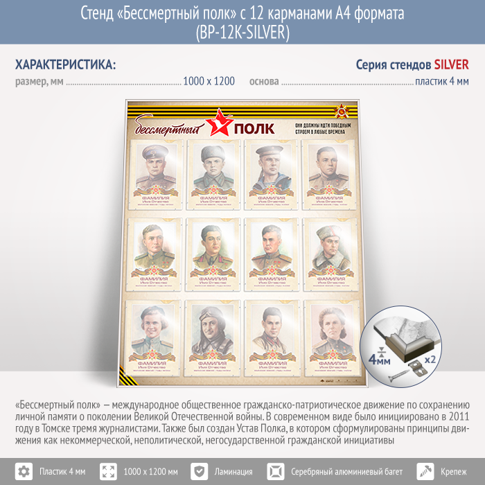 Стенд «Бессмертный полк» с 12 карманами А4 формата (BP-12K-SILVER) в Нижнекамске купить