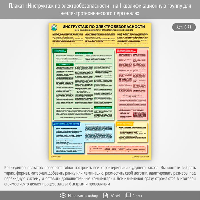 Плакат «Инструктаж по электробезопасности - на I квалификационную группу для неэлектротехнического персонала» (С-71, 1 лист) в Нижнекамске купить