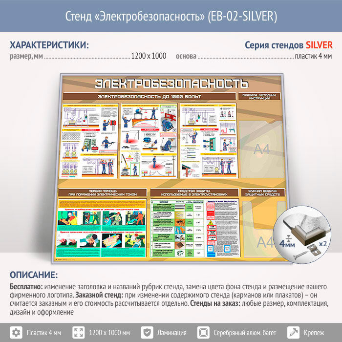 Стенд «Электробезопасность до 1000 вольт» с плоским и объемным карманами (EB-02-SILVER) в Нижнекамске купить