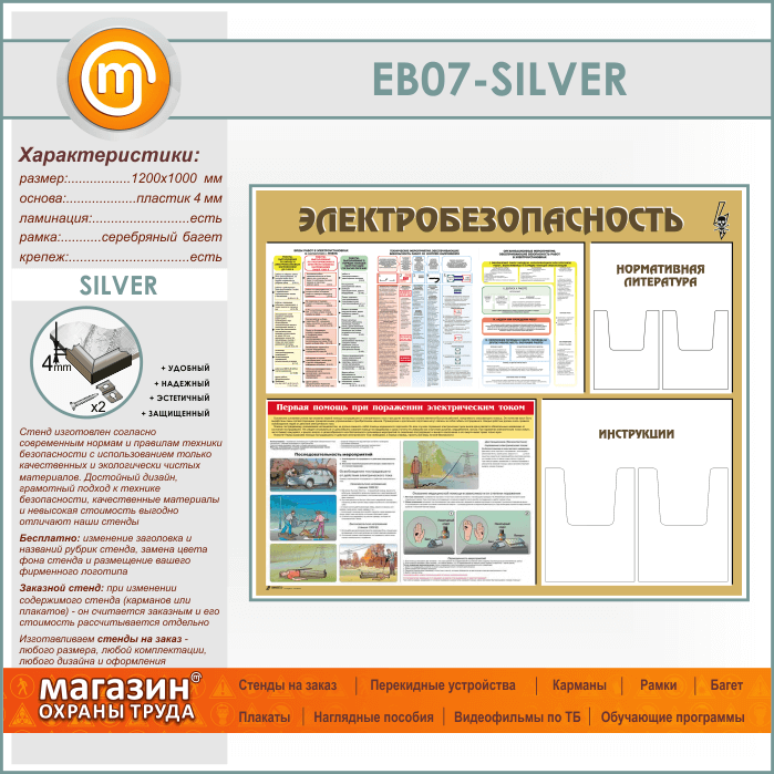 Стенд «Электробезопасность» с 4 объемными карманами (EB-07-SILVER) в Нижнекамске купить