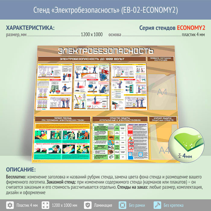 Стенд «Электробезопасность до 1000 вольт» с плоским и объемным карманами (EB-02-ECONOMY2) в Нижнекамске купить