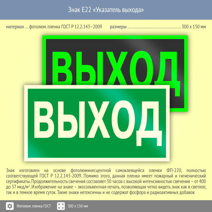 Знак E22 «Указатель выхода» (фотолюминесцентная пленка ГОСТ 34428-2018, 300х150 мм) в Нижнекамске купить