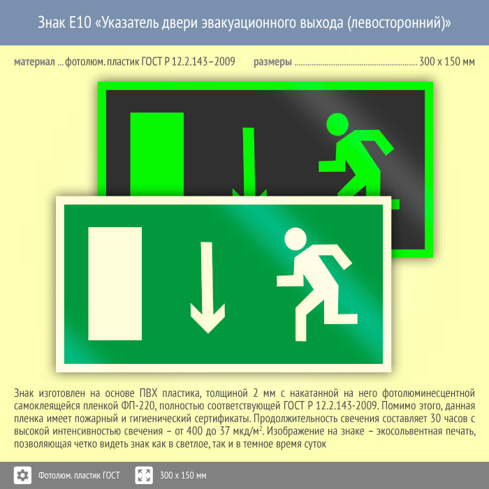 Знак E10 «Указатель двери эвакуационного выхода (левосторонний)» (фотолюминесцентный пластик ГОСТ 34428-2018, 300х150 мм) в Нижнекамске купить