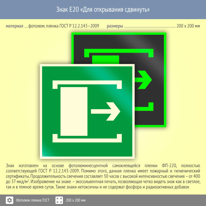 Знак E20 «Для открывания сдвинуть» (фотолюминесцентная пленка ГОСТ 34428-2018, 200х200 мм) в Нижнекамске купить