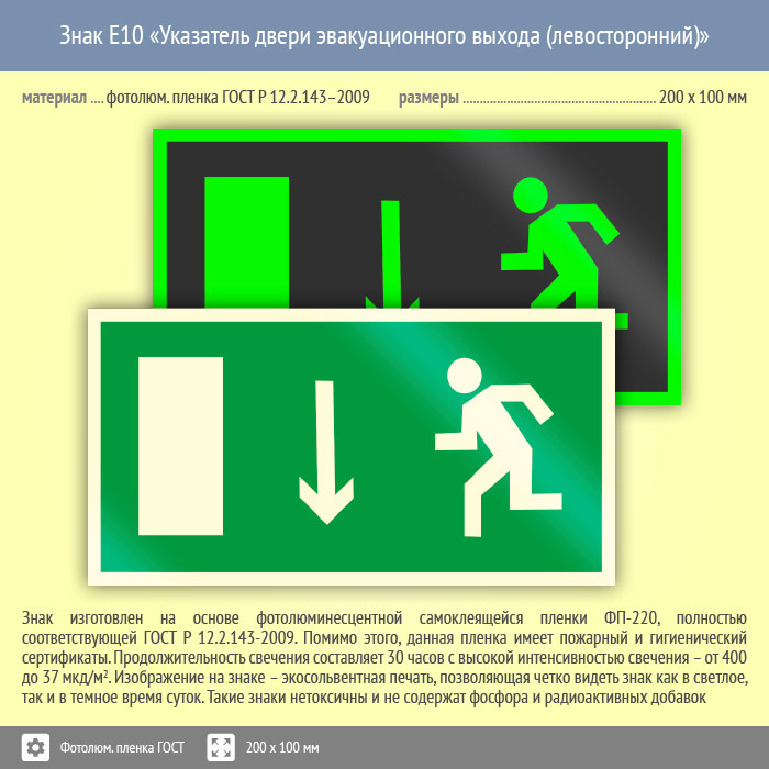 Знак E10 «Указатель двери эвакуационного выхода (левосторонний)» (фотолюминесцентная пленка ГОСТ 34428-2018, 200х100 мм) в Нижнекамске купить