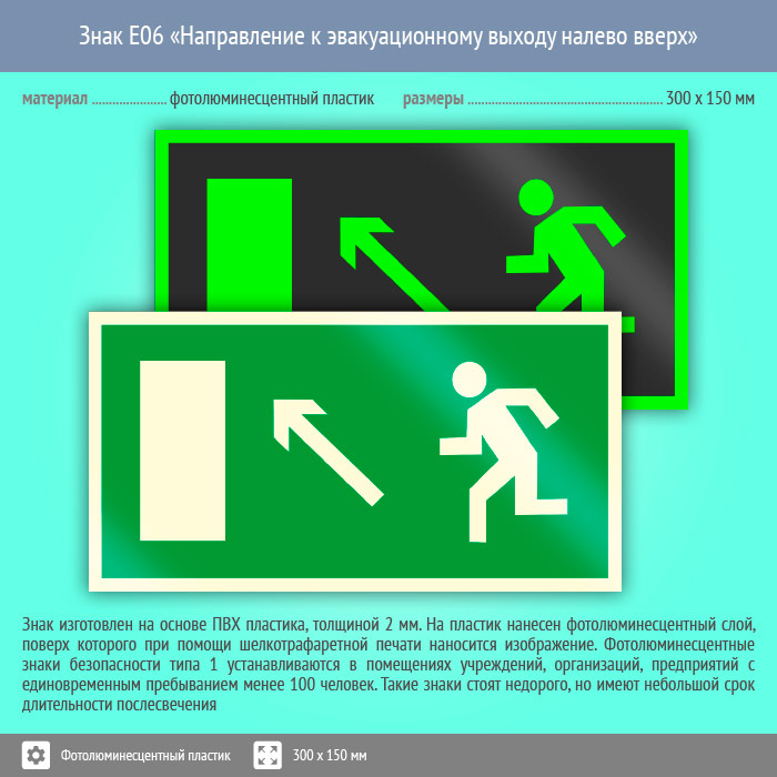 Знак E06 «Направление к эвакуационному выходу налево вверх» (фотолюминесцентный пластик, 300х150 мм) в Нижнекамске купить
