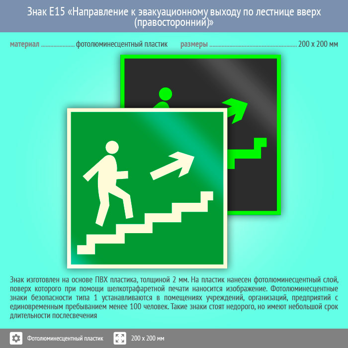 Знак E15 «Направление к эвакуационному выходу по лестнице вверх (правосторонний)» (фотолюминесцентный пластик, 200х200 мм) в Нижнекамске купить