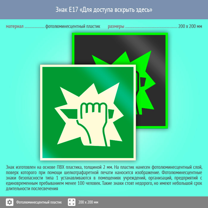 Знак E17 «Для доступа вскрыть здесь» (фотолюминесцентный пластик, 200х200 мм) в Нижнекамске купить
