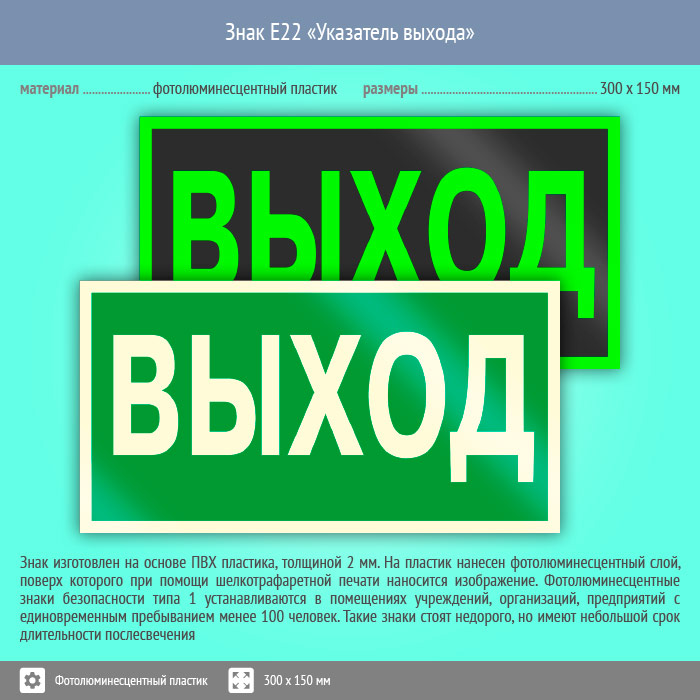 Знак E22 «Указатель выхода» (фотолюминесцентный пластик, 300х150 мм) в Нижнекамске купить