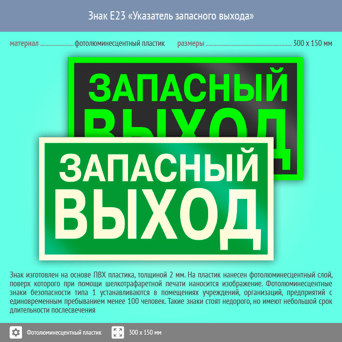 Знак E23 «Указатель запасного выхода» (устаревший) (фотолюминесцентный пластик, 300х150 мм) в Нижнекамске купить