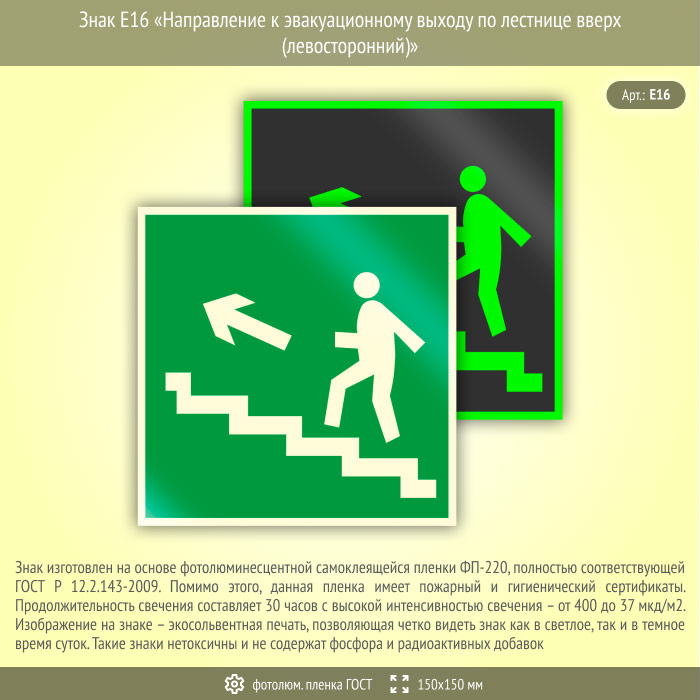 Знак E16 «Направление к эвакуационному выходу по лестнице вверх (левосторонний)» (фотолюминесцентная пленка ГОСТ 34428-2018, 150х150 мм) в Нижнекамске купить