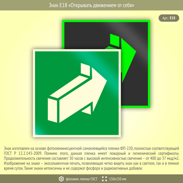Знак E18 «Открывать движением от себя» (фотолюминесцентная пленка ГОСТ 34428-2018, 150х150 мм) в Нижнекамске купить