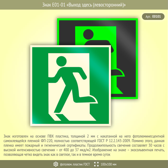 Знак E01-01 «Выход здесь (левосторонний)» (фотолюминесцентный пластик ГОСТ 34428-2018, 100х100 мм) в Нижнекамске купить