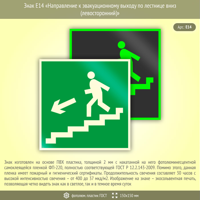 Знак E14 «Направление к эвакуационному выходу по лестнице вниз (левосторонний)» (фотолюминесцентный пластик ГОСТ 34428-2018, 150х150 мм) в Нижнекамске купить