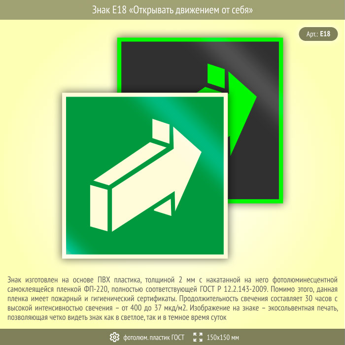 Знак E18 «Открывать движением от себя» (фотолюминесцентный пластик ГОСТ 34428-2018, 150х150 мм) в Нижнекамске купить