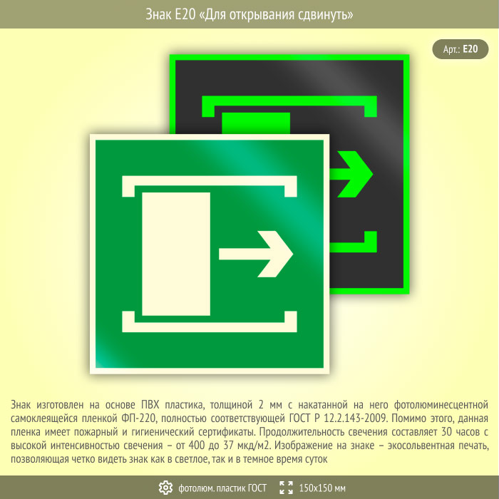 Знак E20 «Для открывания сдвинуть» (фотолюминесцентный пластик ГОСТ 34428-2018, 150х150 мм) в Нижнекамске купить