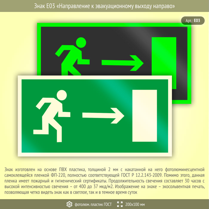 Знак E03 «Направление к эвакуационному выходу направо» (фотолюминесцентный пластик ГОСТ 34428-2018, 200х100 мм) в Нижнекамске купить