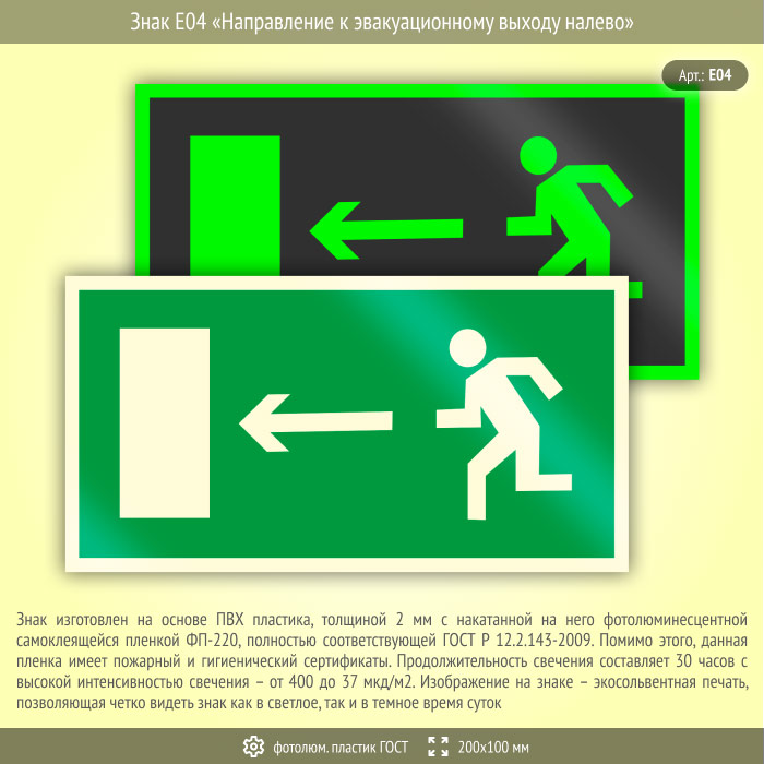 Знак E04 «Направление к эвакуационному выходу налево» (фотолюминесцентный пластик ГОСТ 34428-2018, 200х100 мм) в Нижнекамске купить