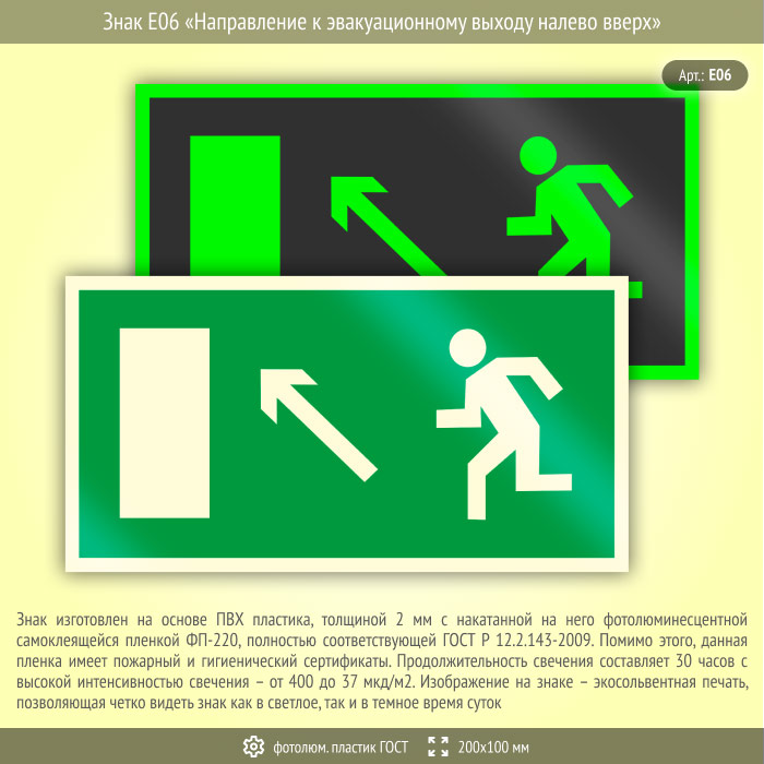 Знак E06 «Направление к эвакуационному выходу налево вверх» (фотолюминесцентный пластик ГОСТ 34428-2018, 200х100 мм) в Нижнекамске купить