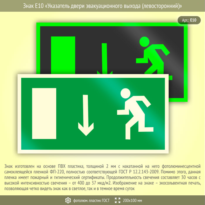 Знак E10 «Указатель двери эвакуационного выхода (левосторонний)» (фотолюминесцентный пластик ГОСТ 34428-2018, 200х100 мм) в Нижнекамске купить