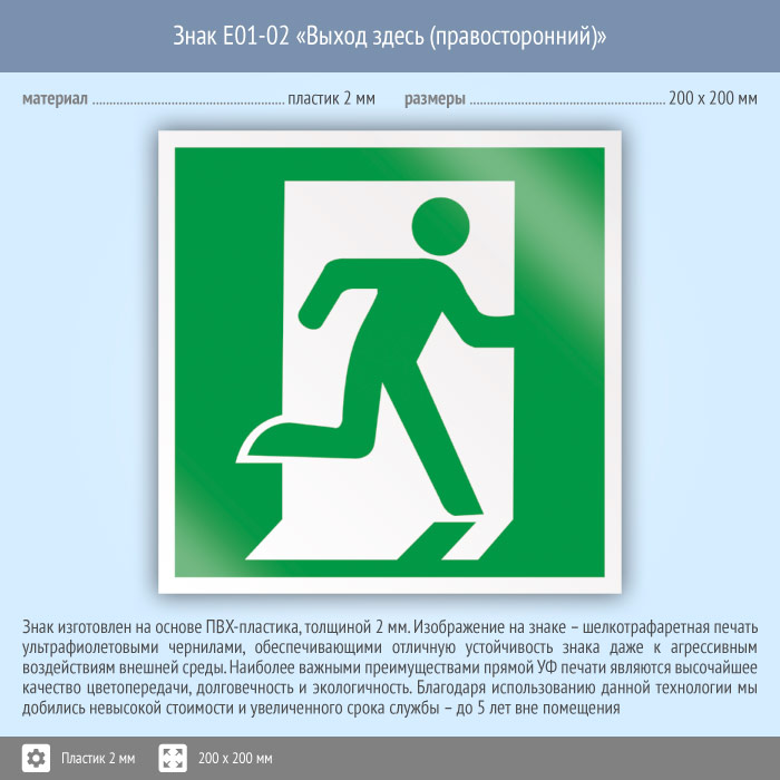 Знак E01-02 «Выход здесь (правосторонний)» (пластик, 200х200 мм) в Нижнекамске купить