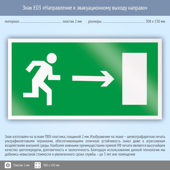 Знак E03 «Направление к эвакуационному выходу направо» (пластик, 300х150 мм) в Нижнекамске купить