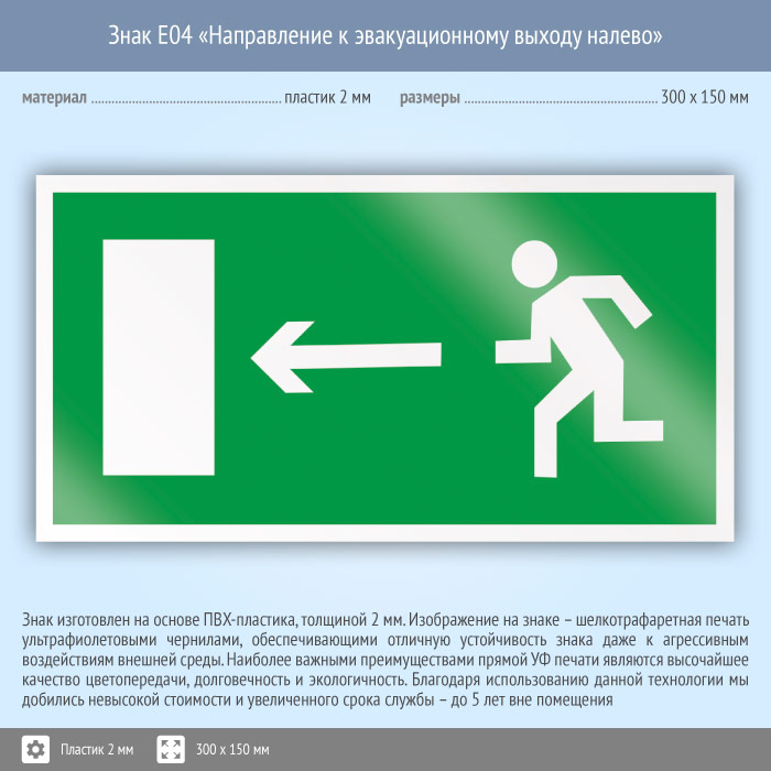 Знак E04 «Направление к эвакуационному выходу налево» (пластик, 300х150 мм) в Нижнекамске купить