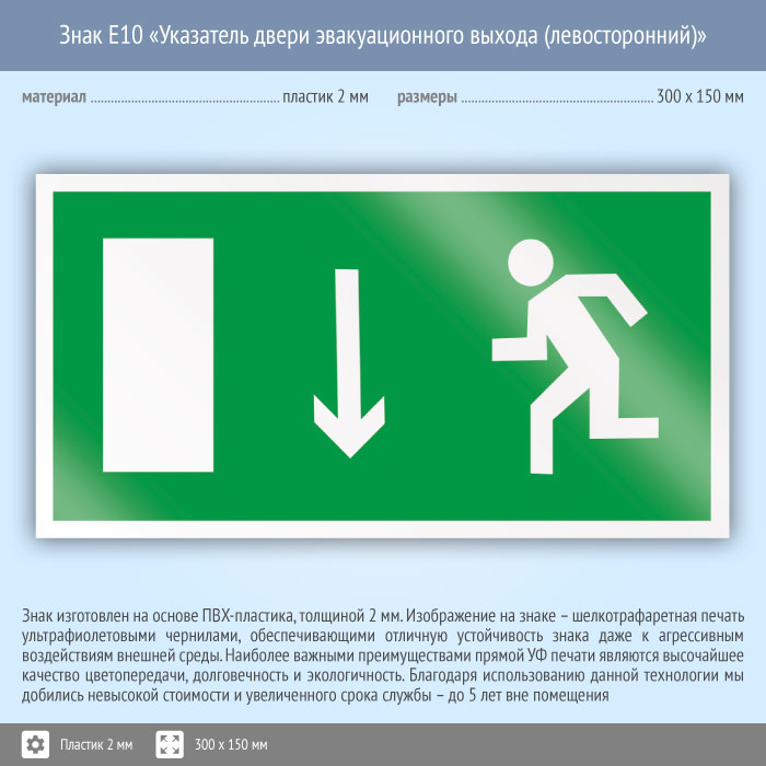 Знак E10 «Указатель двери эвакуационного выхода (левосторонний)» (пластик, 300х150 мм) в Нижнекамске купить