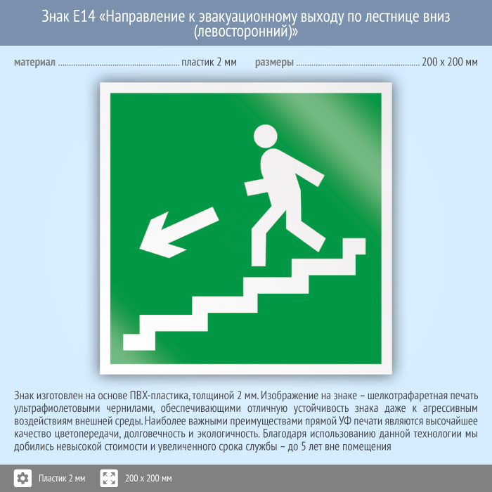 Знак E14 «Направление к эвакуационному выходу по лестнице вниз (левосторонний)» (пластик, 200х200 мм) в Нижнекамске купить