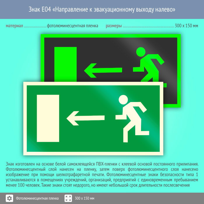 Знак E04 «Направление к эвакуационному выходу налево» (фотолюминесцентная пленка, 300х150 мм) в Нижнекамске купить