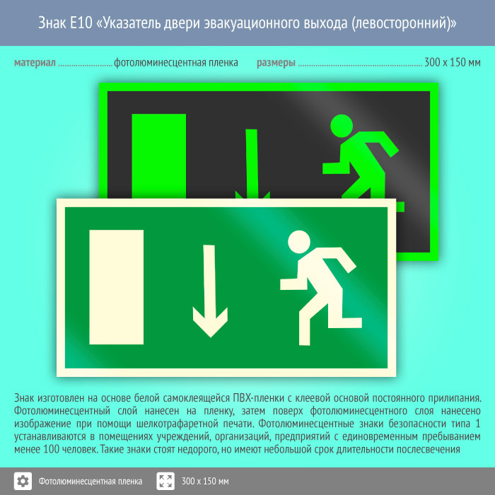 Знак E10 «Указатель двери эвакуационного выхода (левосторонний)» (фотолюминесцентная пленка, 300х150 мм) в Нижнекамске купить
