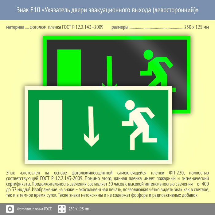 Знак E10 «Указатель двери эвакуационного выхода (левосторонний)» (фотолюминесцентная пленка ГОСТ 34428-2018, 250х125 мм) в Нижнекамске купить