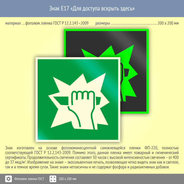 Знак E17 «Для доступа вскрыть здесь» (фотолюминесцентная пленка ГОСТ 34428-2018, 200х200 мм) в Нижнекамске купить