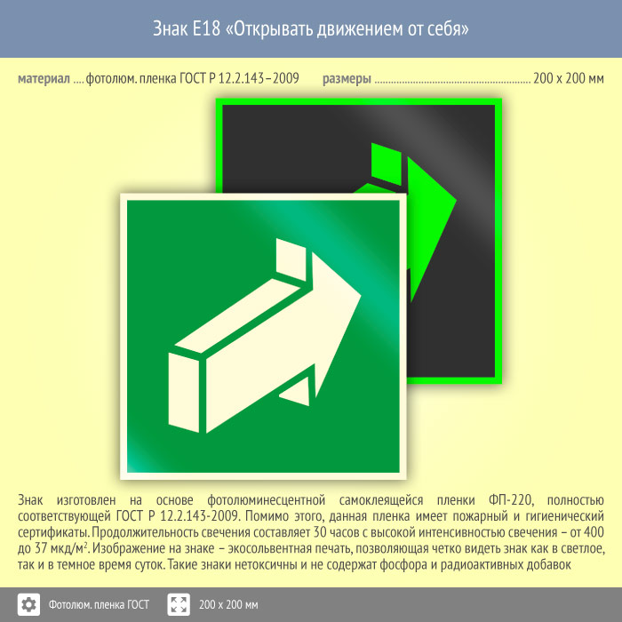 Знак E18 «Открывать движением от себя» (фотолюминесцентная пленка ГОСТ 34428-2018, 200х200 мм) в Нижнекамске купить
