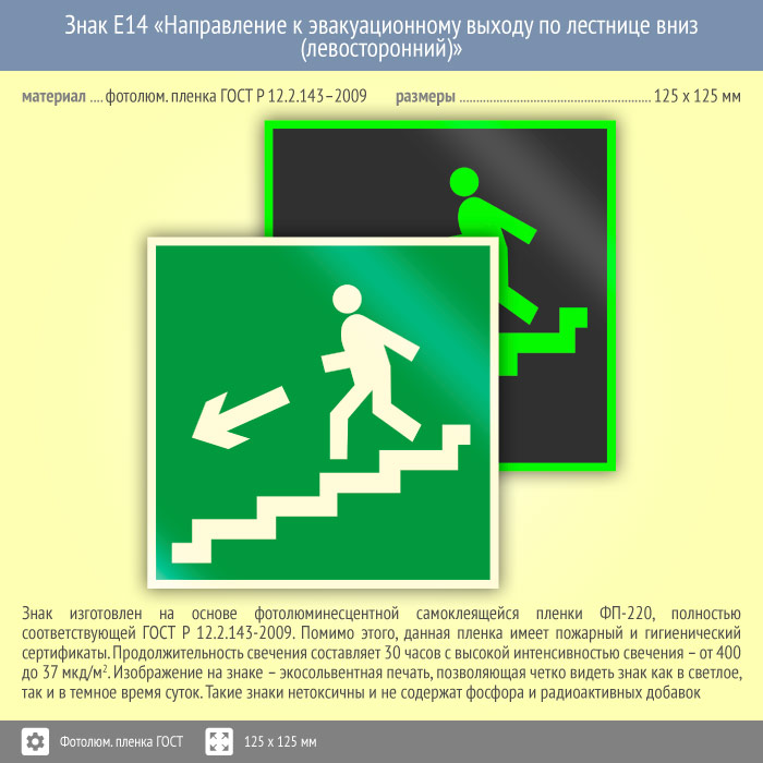 Знак E14 «Направление к эвакуационному выходу по лестнице вниз (левосторонний)» (фотолюминесцентная пленка ГОСТ 34428-2018, 125х125 мм) в Нижнекамске купить