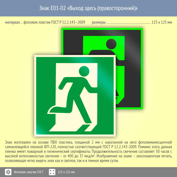 Знак E01-02 «Выход здесь (правосторонний)» (фотолюминесцентный пластик ГОСТ 34428-2018, 125х125 мм) в Нижнекамске купить