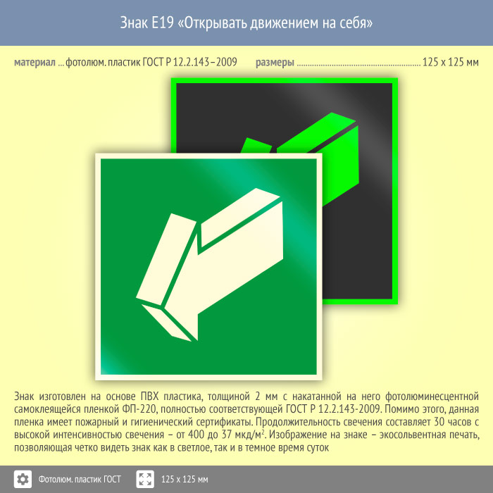 Знак E19 «Открывать движением на себя» (фотолюминесцентный пластик ГОСТ 34428-2018, 125х125 мм) в Нижнекамске купить